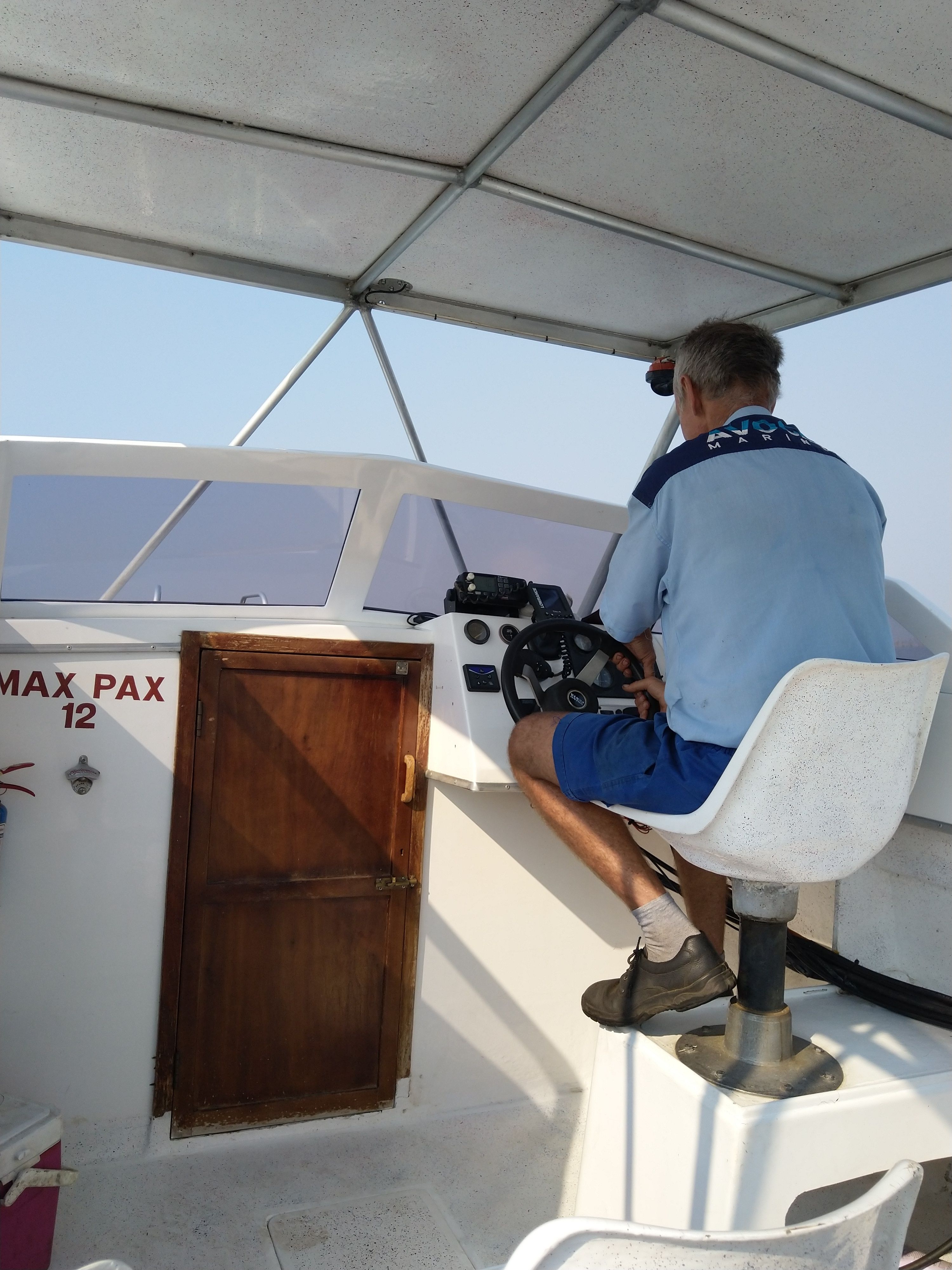 Gus, der Workshop-Manager holt uns ab, sie hätten gerade nicht genügend Leute, haucht er mit einer Fahne, die es in sich hat. Fragend schauen wir uns an: ist der besoffen? Wir steigen ein und bald schon genießen wir den angenehmen Fahrtwind bis unser Captain den Cooler öffnet und uns zwei Flaschen Wasser zuwirft.