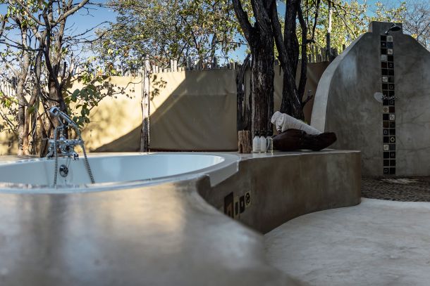 Micha testet zufrieden die Freiluftdusche vor dem Zelt und kann so endlich den Staub der vergangen Tage abwaschen. Inzwischen ist das Thermometer auf über 30 Grad gestiegen, da freuen wir uns doch richtig über den Nachmittags-Tee mit Gebäck, bevor es wieder mit dem Safari Jeep los geht.