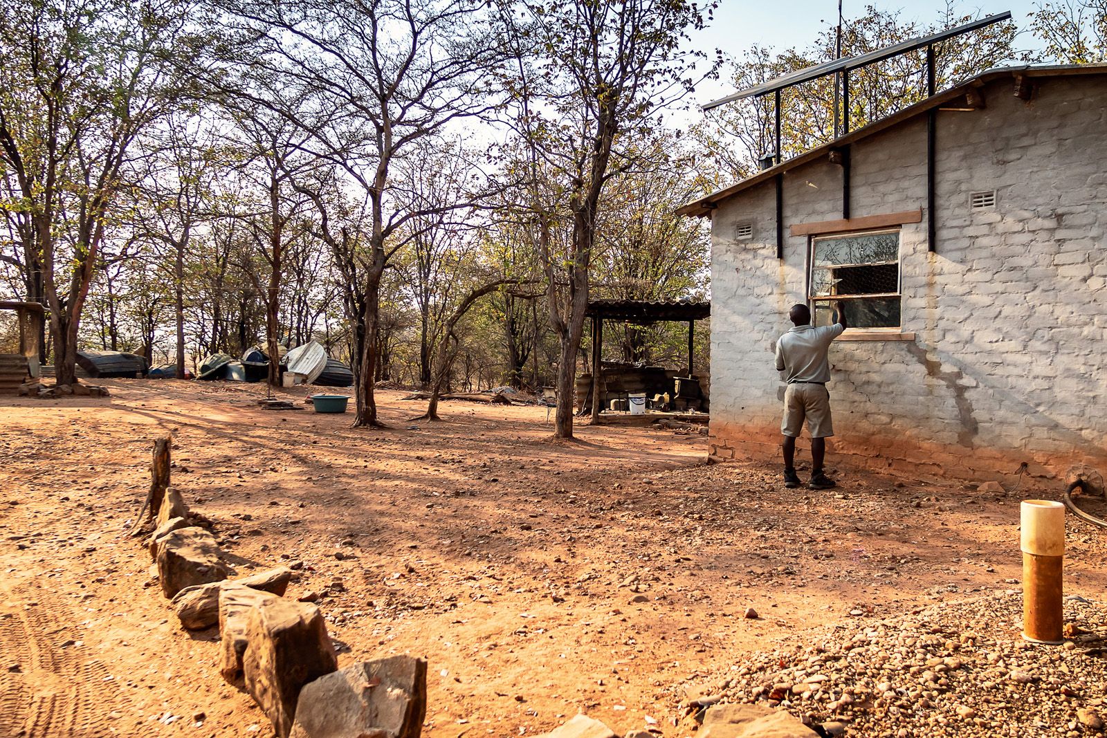 Unser Guide Campbell taut nach einiger Zeit auf und wird sogar richtig gesprächig. Wir haben Spaß, sehen viel und freuen uns an dem einmaligen Licht und der faszinierenden Landschschaft, die uns umgibt. Die Lodge liegt direkt am Matusadona National Park, wenn wir also losfahren, müssen wir jedesmal am Office vorbei und uns anmelden und natürlich eine Eintrittsgebühr zahlen, wie wir später feststellen werden. Das Office ist ein notdürftig zusammengezimmertes Gebäude, das die nächste Regenzeit wohl nicht überstehen wird. Campbell reicht das Buch durch ein zerbrochenes Fenster hindurch und wir wundern uns, wie hier jemand überhaupt längere Zeit Dienst machen kann oder will.
