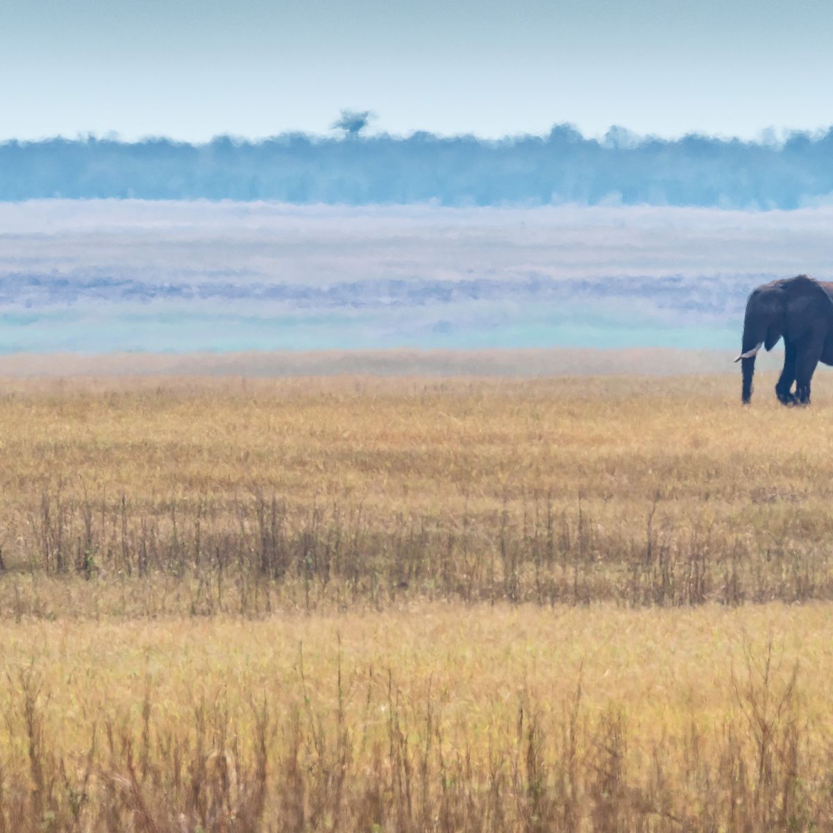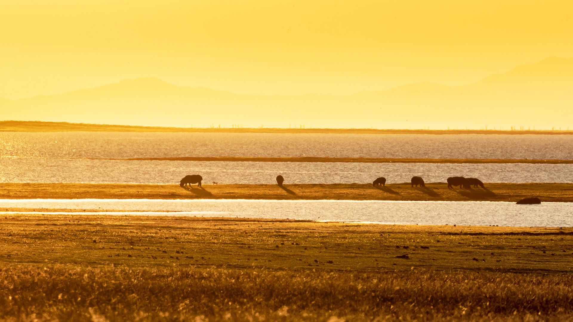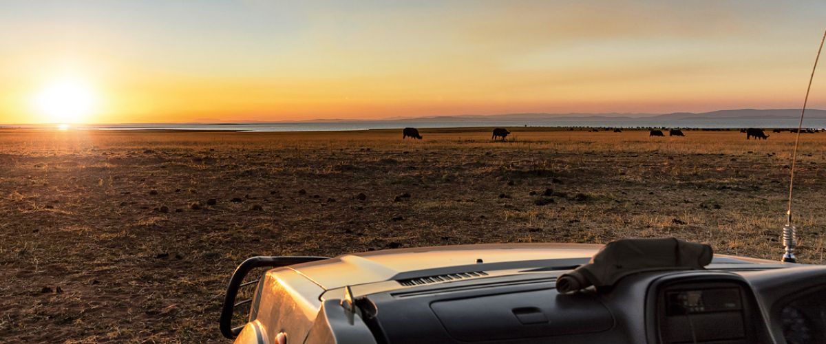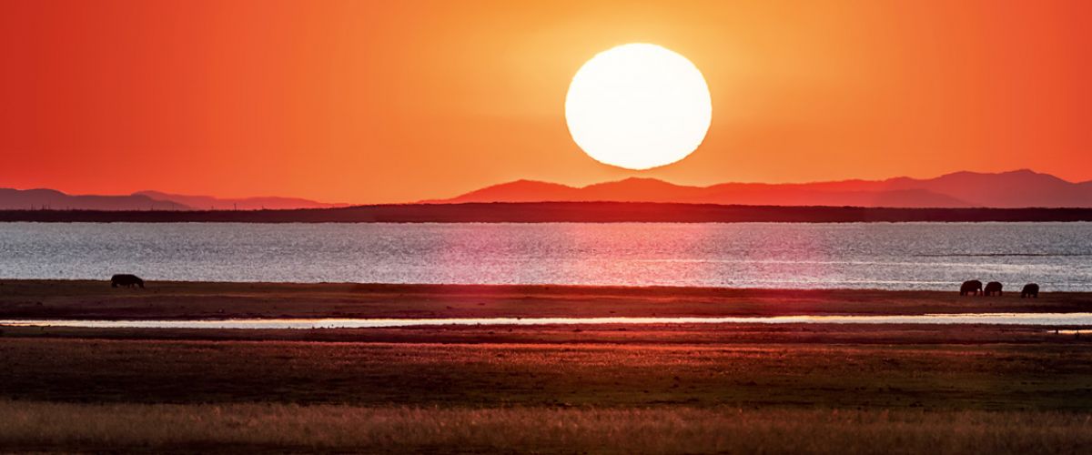 Der See hat notorischen Wasser-Tiefstand und gibt jetzt am Rande weite Flächen von goldgelbem Grasland frei, die normalerweise mit Wasser bedeckt wären. Auf dieser Ebene tummeln sich jetzt aber Herden von Büffeln, zahlreiche Elefanten, Zebras und Antilopen und natürlich Nilpferde.